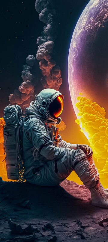 A digital artwork of an astronaut in a classic suit, sitting on rocky terrain beneath a vivid alien planet, blending realism with surreal, colorful space.