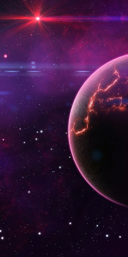 A vibrant cosmic wallpaper featuring a glowing planet with crackling orange veins, set against a rich purple and black starry sky.