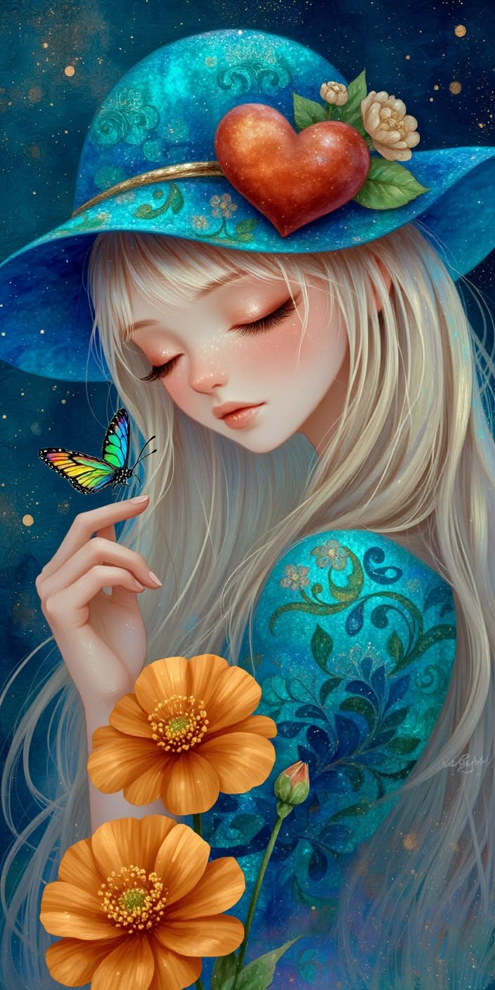 A serene blonde woman in teal holds a butterfly and flower against a dreamy starry sky.