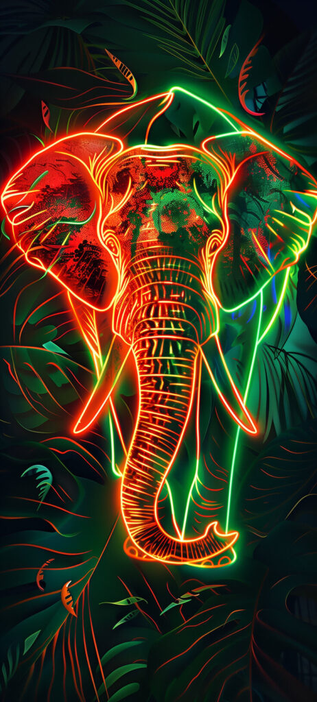 A playful young elephant with a cheerful expression is adorned with bright floral patterns, surrounded by vibrant tropical foliage.
